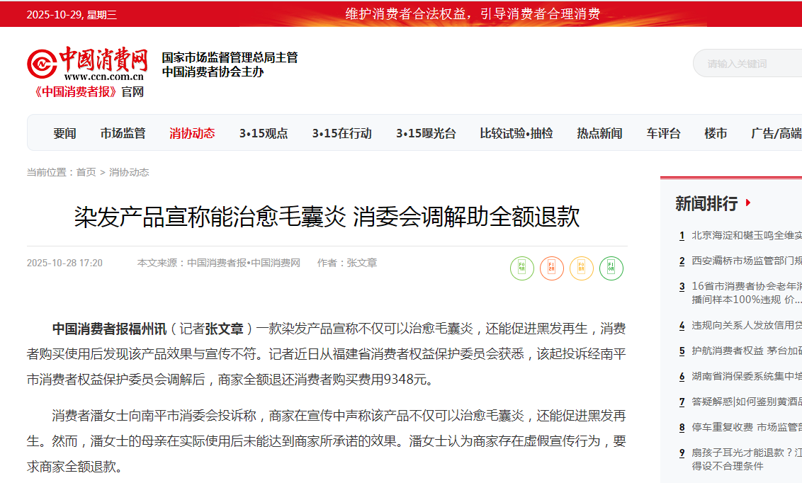 - 染发产品宣称能治愈毛囊炎 消委会调解助全额退款