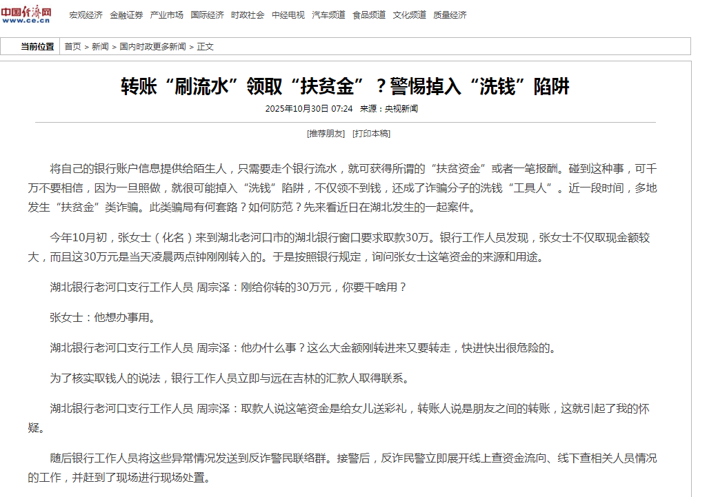 - 转账“刷流水”领取“扶贫金”?警惕掉入“洗钱”陷阱