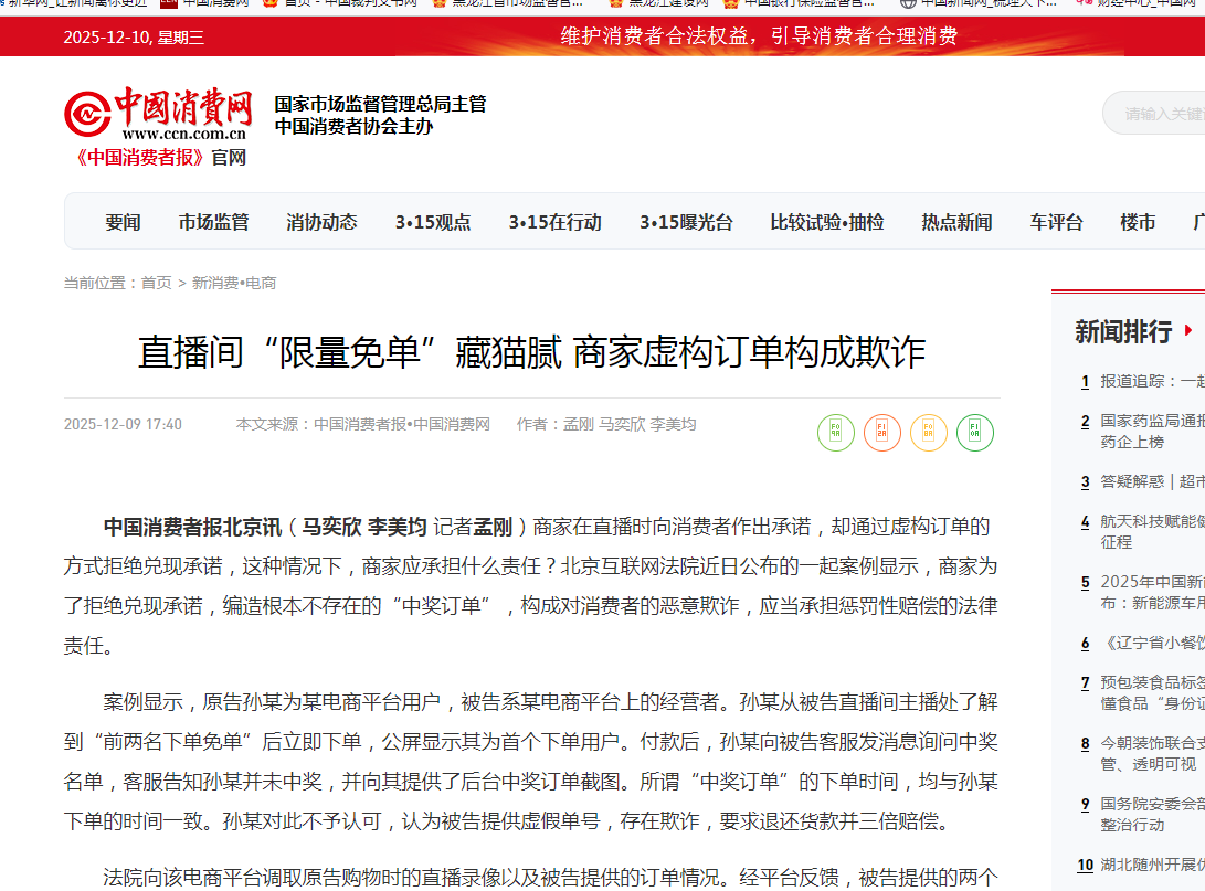 直播间“限量免单”藏猫腻 商家虚构订单构成欺诈