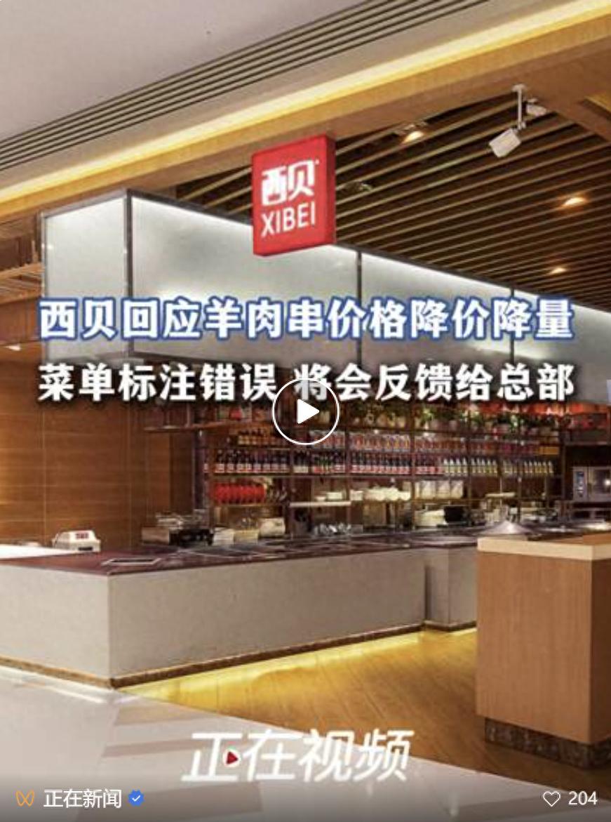 1月28日,上海宝女士向《正在新闻》反映,她于2025年9月19日前往西贝用餐,羊肉串的价格为9元一串,克数标注为25克,“现在西贝羊肉串价格虽降到了7元一串,克数却更改为了18克。”