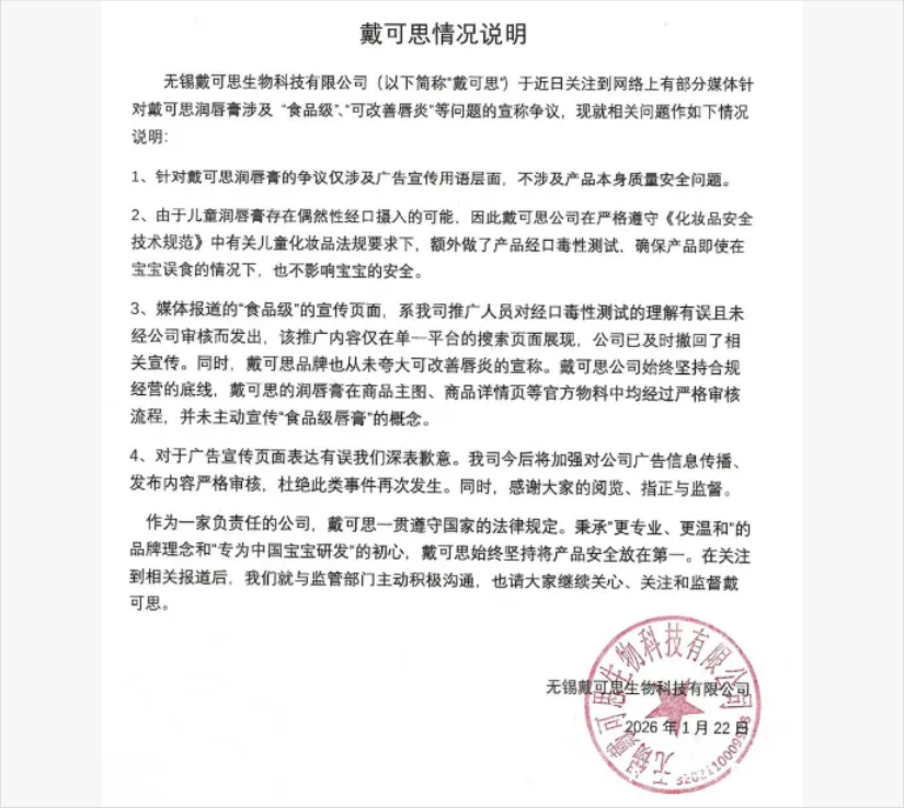 1月22日,戴可思在多个社交平台官方公众号均就此事发布声明。声明显示,媒体报道的“食品级”的宣传页面,系公司推广人员对“经口毒性测试”的理解有误且未经公司审核而发出,该推广内容仅在单一平台的搜索页面展现,公司已及时撤回了相关宣传。戴可思表示,针对戴可思润唇膏的争议仅涉及广告宣传用语层面,不涉及产品本身质量安全问题。