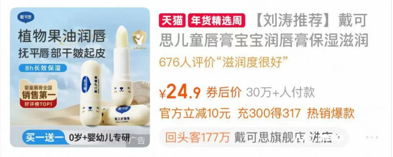 有媒体近日报道,戴可思于电商平台旗舰店销售的一款儿童唇膏在宣传页面中称“食品级润唇膏”,涉嫌违规。