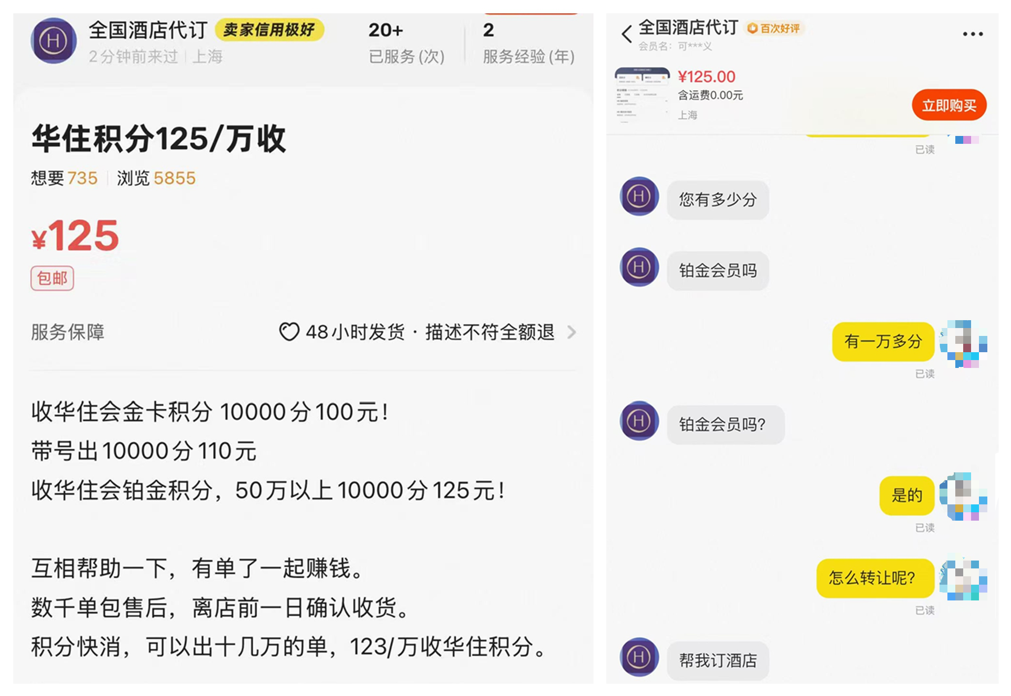 记者在二手平台上看到有从事酒店代订的卖家,不只代订酒店,也同时收购积分。页面介绍,收华住会金卡1万积分,收购价100元;铂金会员积分达50万以上,每1万积分收购价为125元。而所谓积分收购就是“帮他订酒店”。