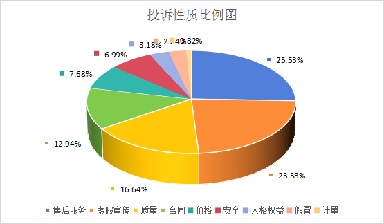 按投诉性质分类,售后服务问题占比25.53%,虚假宣传问题占比23.38%,质量问题占比16.64%,合同问题占比12.94%,价格问题占比7.68%,安全问题占比6.99%,人格权益问题占比3.18%。与上个统计周期相比,虚假宣传、售后服务、安全问题投诉量同比上升,质量、价格、计量问题投诉量同比下降。