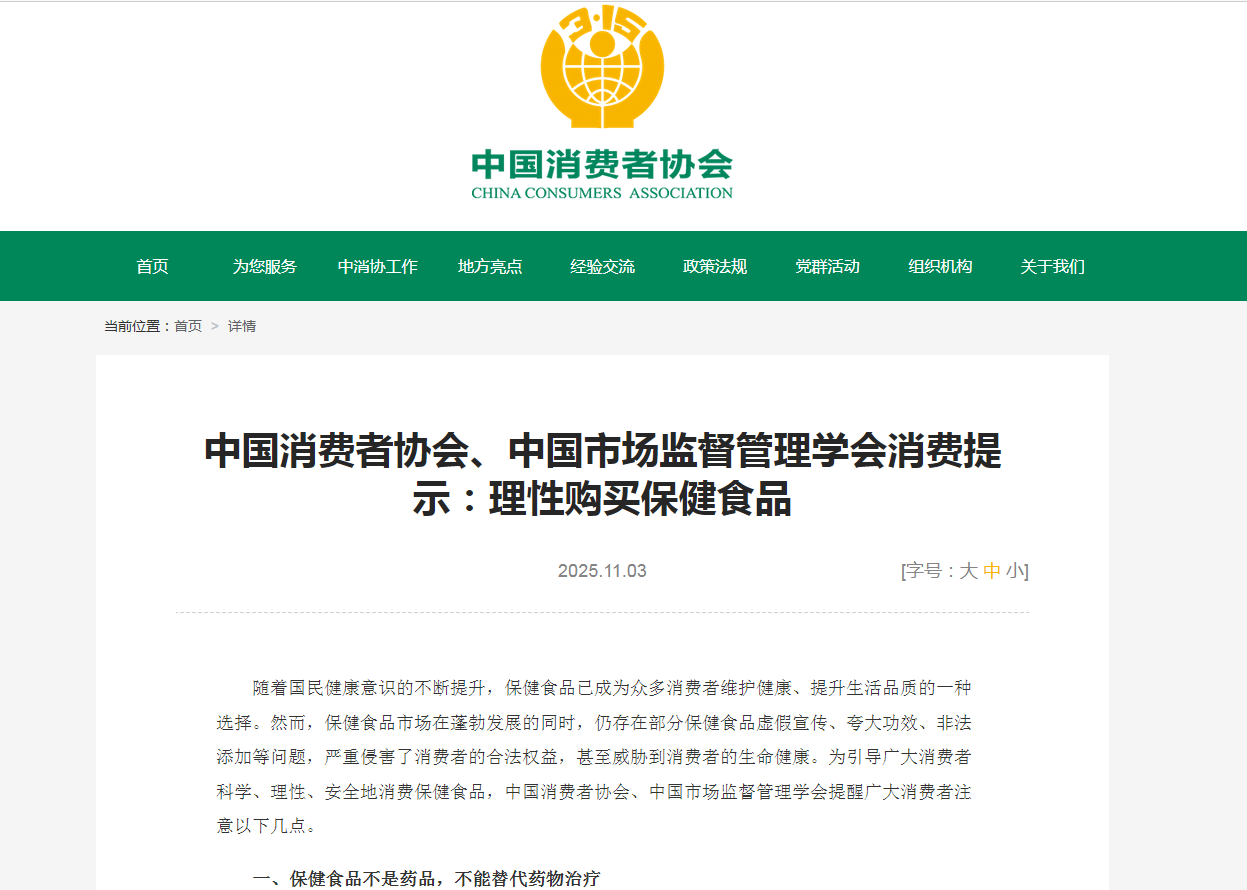 中消协、中国市场监督管理学会消费提示:理性购买保健食品