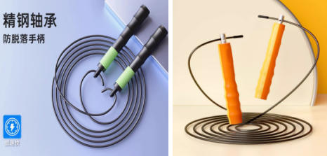 4.竞赛用。选择轴承结构手柄,确保高速旋转流畅。绳体材质轻量化(如钢丝包胶),减少空气阻力,提升转速和稳定性。钢丝绳为竞技首选,推荐2.5mm直径包胶款,搭配轴承手柄和缓冲套,避免裸露钢丝划伤。
