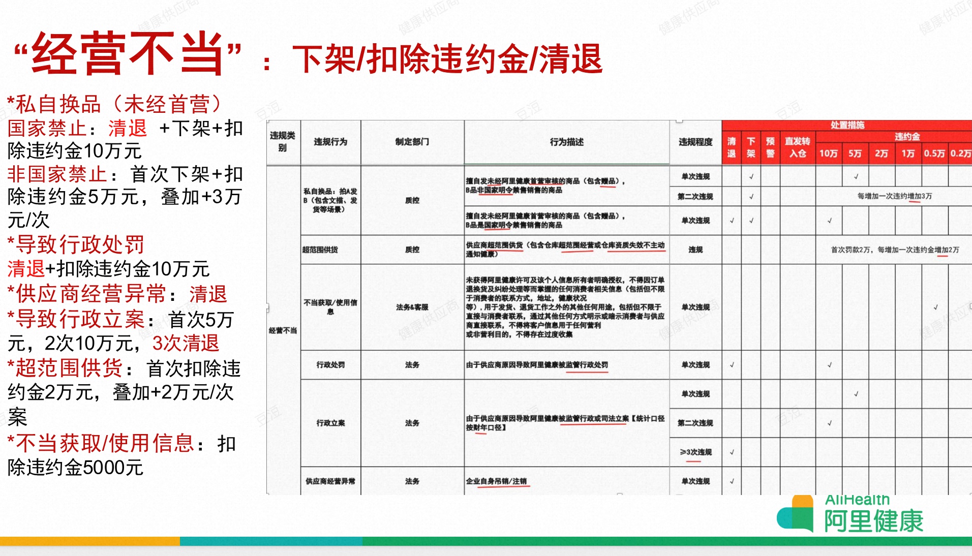 阿里健康供应商管理规则显示,若因供应商原因导致阿里健康被行政立案,将扣除供应商5万元违约金,若导致阿里健康被行政处罚,将直接清退供应商并扣除10万元违约金。