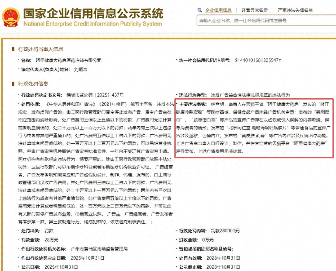 而据国家企业信用信息公示系统,就在2025年10月31日,阿里健康大药房医药连锁有限公司因设计、制作并发布未经审查的医疗器械、保健食品广告,及发布虚假误导广告,发布普通食品的宣传广告涉及淫秽、色情内容等,被罚款28万元。