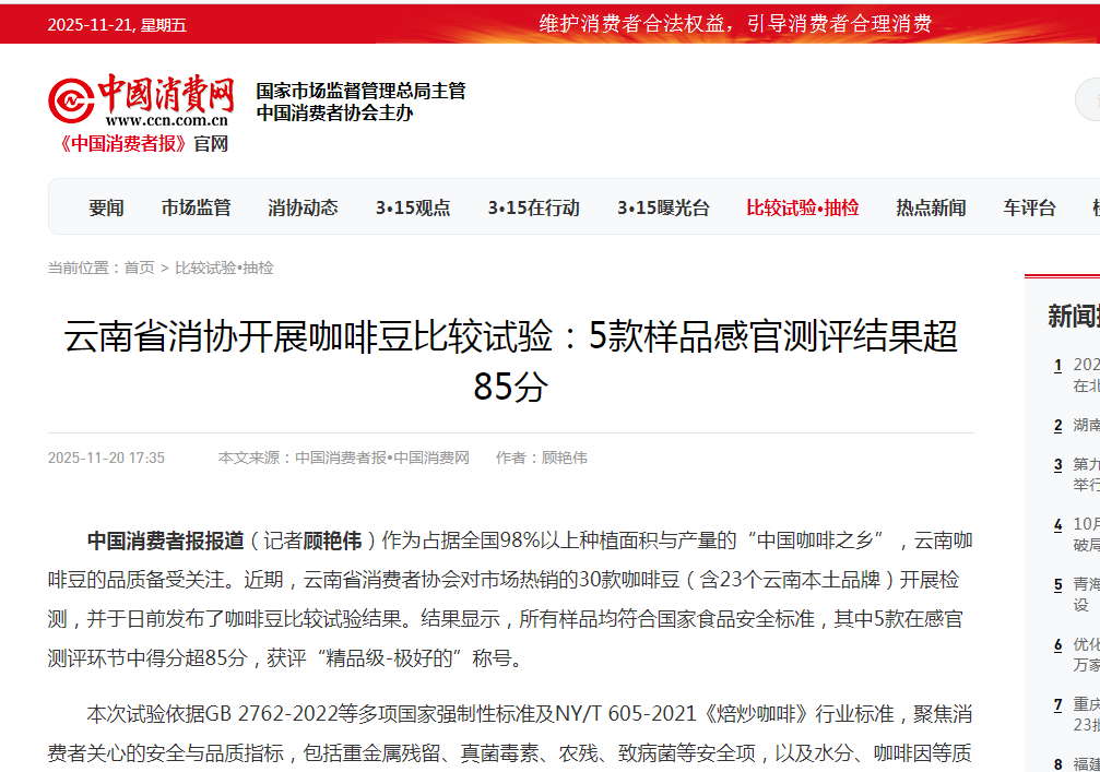 消协开展咖啡豆比较试验:5款样品感官测评结果超85分