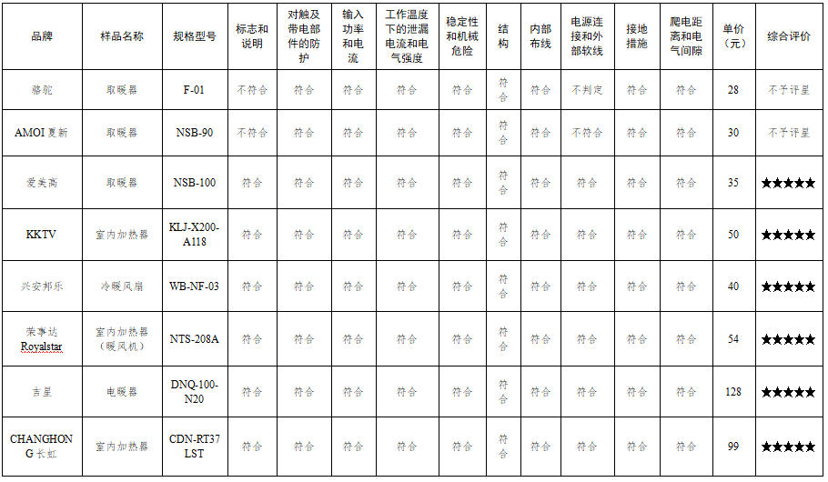 8款室内加热器测评结果出炉 “骆驼”“AMOI夏新”2款样品存安全隐患