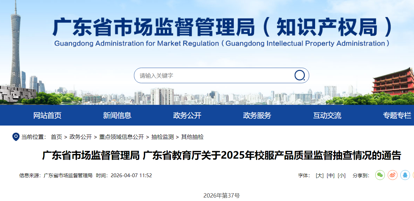 根据《中华人民共和国产品质量法》《产品质量监督抽查管理暂行办法》《广东省产品质量监督条例》等相关规定,2025年,广东省市场监督管理局、广东省教育厅联合组织开展校服产品质量监督抽查。现将抽查情况通告如下。