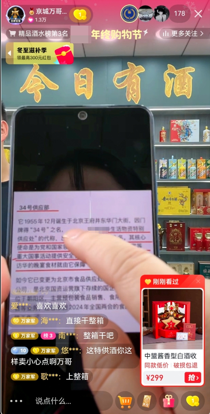 该主播对观众说:“买到后不能倒手卖,出去不要乱说‘驻京办事处’这5个字。”随后,她拿出手机口播屏幕上的文字:“北京市食品供应处34号供应部……其实是‘××领导生活物资特别供应处’。”直播画面显示,“酒世界官旗店”在当时是精品酒水榜第2名。