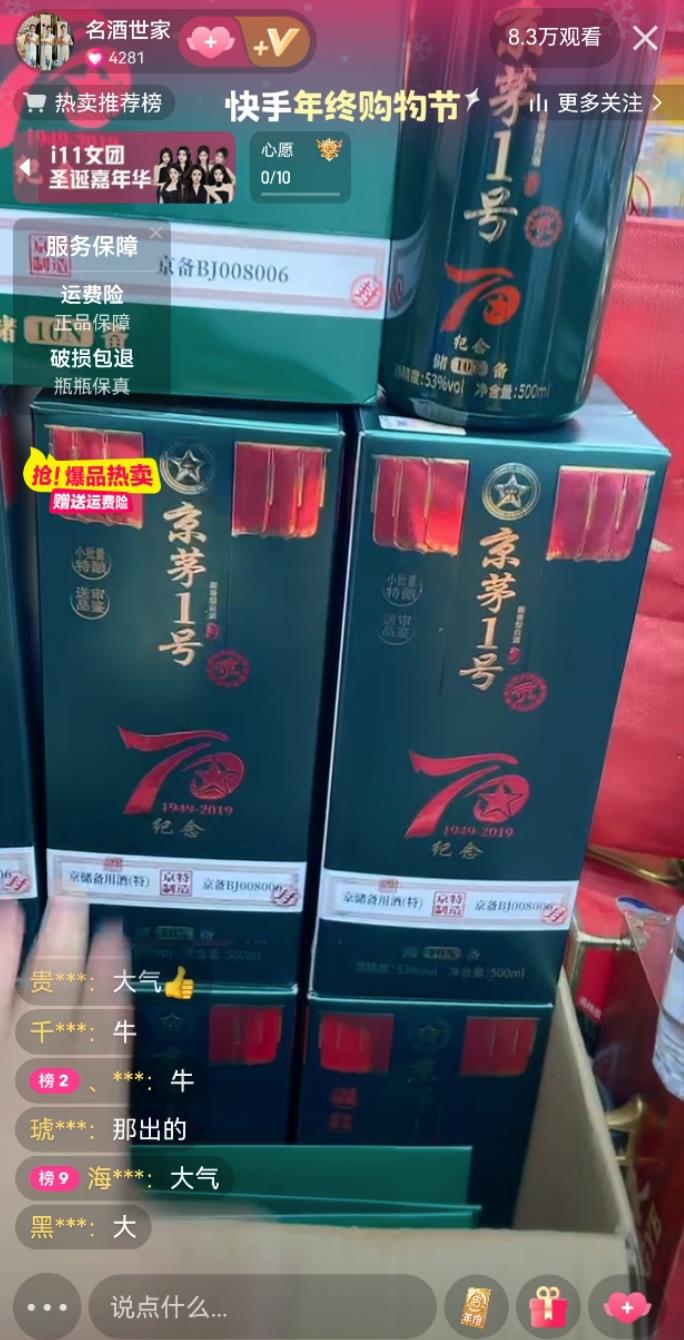 “这个京茅1号就是内供版的茅子。”2025年12月23日21时许,在某平台一个名为“名酒世家”(平台号3847125058)的直播间里,主播介绍一款酒时称:“为什么称为1号,因为是只内供不外销的。”随后指着酒瓶上印着的红色“贡”字说:“你普通老百姓有钱指定也不好使。”