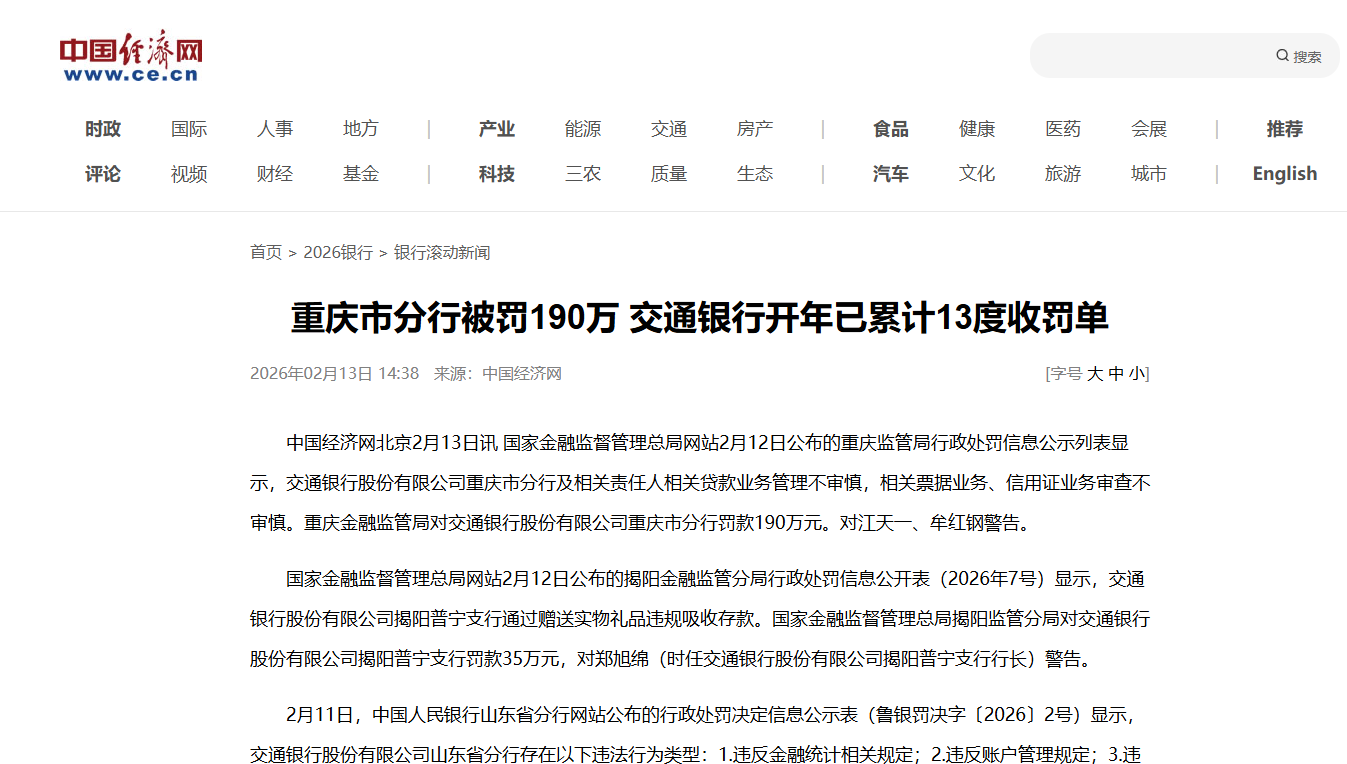 重庆市分行被罚190万 交通银行开年已累计13度收罚单